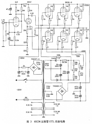 OTL功放级采用SEPP并联推挽电路,可选用6KD6、6L6、6P3P等屏压范围大的功放管,并将其改为三极管接法。采用6只功放管并联的输出方式,使输出阻抗达到8~16Ω。