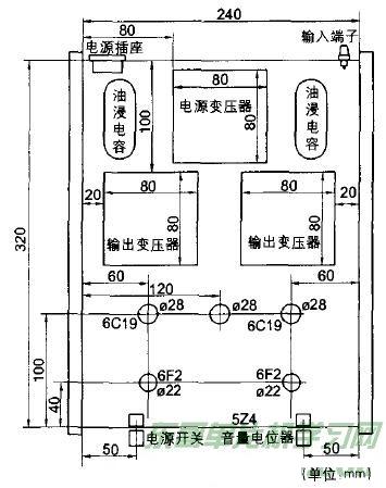 我们制作一台胆机,不但要求其音质优美,外观也不能忽视,因为一件音响器材,其功能不仅是供我们欣赏音乐,而且还应该是一件家居装饰的艺术品,在视觉上要求美观、大方,给人一种赏心悦目的感觉。为此,在制作这台胆机时,笔者采用了对称式的设计,其底板加工如图4所示。