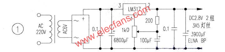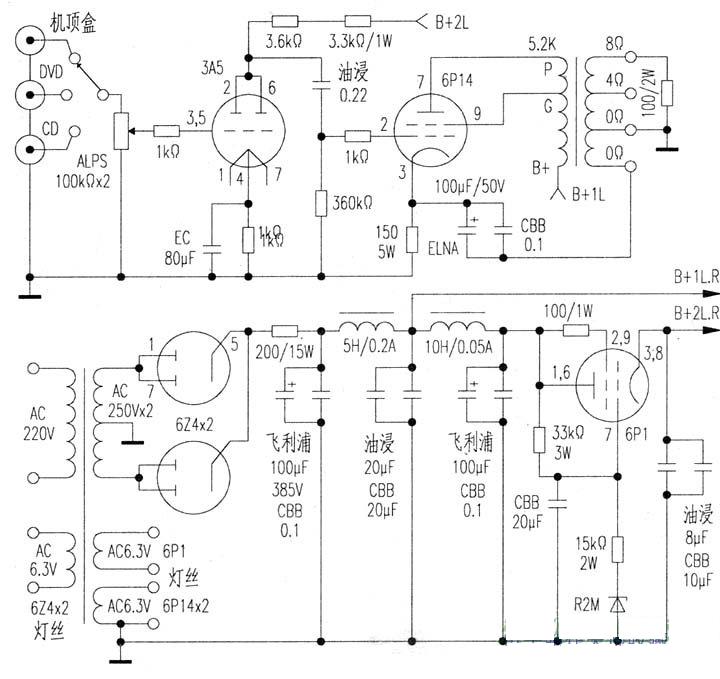 小功放(其实体积并不小)采用电子管3A5作前级电压放大,推动6P14作功率输出。6P14论音质是大多数功率管无法比拟的,唯输出功率稍小。由于同类管的参数相差较大,使用时应予配对。图1中所用每个元器件的选用均经笔者严格试音和反复调校,不宜轻易改动,否则可能影响音质。电源变压器和输出变压器选用广西玉林“宝尔真”牌的产品。电源变压器型号为80WB型,输出变压器为6.5瓦,购时最好能测试配对。滤波电解电容器为菲利浦蓝六角电解电容,容量1OOμF至220μF。油浸电容器为美国罐装油浸电容,容量在20μF左右,前级稍小为8μF。CBB电容器为美国APC或EC薄膜电容,电阻器为美国DALE军工电阻或国产红色金属膜电阻。本放大器电路并不复杂,施加的负反馈亦较浅,在电源电路下足功夫,保证了声音的重播质量。