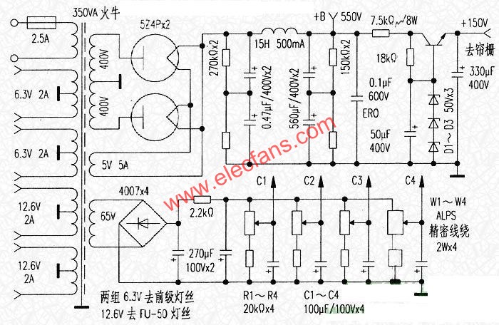 功放级:FU-50的栅负压为固定供给式,负压板全部元件装在一块10cm×10cm的万能板上,负压调节电位器一定要使用高品质的产品,若W发生开路等不良状况必将导致功放管屏流骤增而烧毁。本机使用了4只ALPS精密线绕电位器,以确保机器的安全。在这次DIY中,输出变压器为邮购的四川广汉“凯立”成品牛,350VA的火牛为自制品,整机造价控制在700元左右。