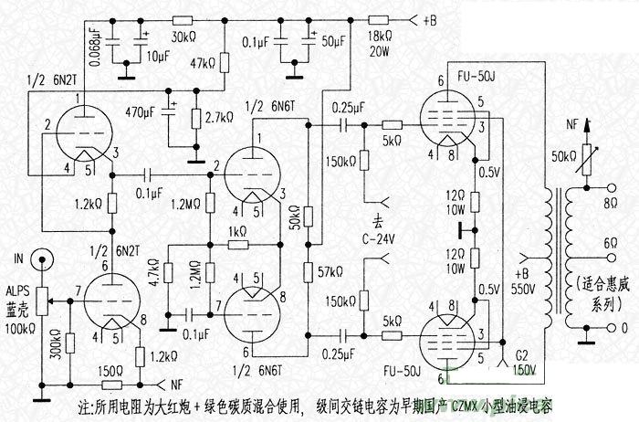 胆机制作选管很重要,一些天价名胆让人望而却步,我们身处电子管生产大国,在众多的胆管中不乏一些性价比极高的靓胆,Fu-50便是其中的佼佼者。此管为旁热式束射五极管,以前主要应用在通讯设备中作高频振荡或射频功率放大,有小300之称。用此管装配的推挽机音乐昧要好于6P3P、KT88等管,输出功率很容易做到50W以上。其高频细腻传神,低频生猛刚健,对付一般落地三分频倒相式音箱也能从容不迫。