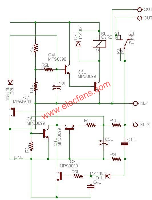 电路由D2, Q2, R8, Q1, Q6, R2, C3, R7组成. R7, C3为一双向的DC滤波器. 由于是要侦测直流, 所以输入讯号只要在一个正半波或是负半波上造成足够的电压使得Q6导通(正半波)或是Q1导通(负半波) , 都会使得Q2基极电位入地使得C2被快速放电, 继电器跳起. R7, C3的值, 决定最低DC动作范围及极低频音乐的容许度. C3为NP无极性电容.