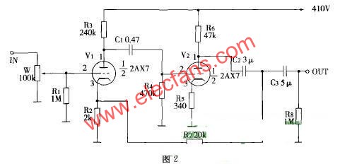 胆前级放大器的线路较为简单,可用两级共阴极放大,或一级共阴极放大加一级阴极输出器,再加入环路负反馈调整增益。图2是名机Matisse Reference 胆前级的放大线路,输入级用12AX7,输出级用12AT7,它的高频特性好,此机综合了两胆的特性,音色清澈通透,频响宽,音乐细节清晰、丰富,失真小,由于输出电容容量较大,低音的量感、力度好。此机放大管屏极