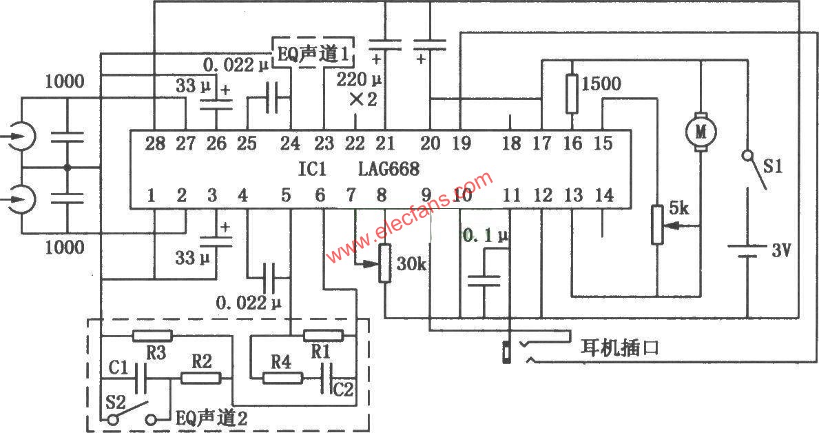 LAG665和LAG668都是单片放音机IC,LAG668是LAG665的改进型,二者内部电路结构大致相同。对于偏爱低音的爱好者,可用LAG668替换原机LAG665,同时对相应的外接电路加以改动,以实现低音效果的提升。低频提升的措施通常是衰减高、中频。高、中频衰减后,信号同时减弱,对后级的激励减小,影响音频灵敏度和动态效果,音量降低,不能达到额定的功率输出。其补救措施一是提高前级的电压增益;二是增加一级电压放大;三是提高后级的输入阻抗,以提高后级的输入灵敏度,用较小的激励就能满足后级需要;四是提高功放的增益。LAG668采用了后两种措施,一是将后级(衰减器)的输入阻抗由LAG665的20k12提高到200kt2;二是将功放的电压增益由LAG665的28dB提高到38dB。如图是随身听低音提升电路,声道1的音调网络与声道2相同。