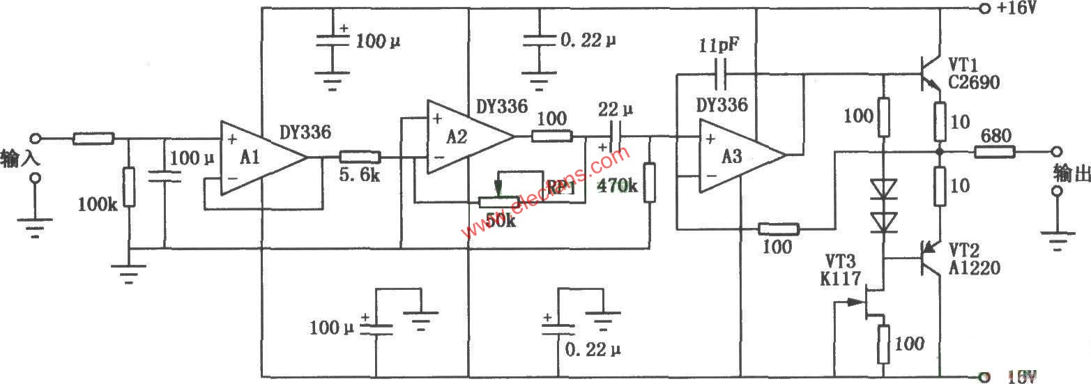 电路采用3只DY336低噪声、高品质运放。其中A1用作输入信号的缓冲跟随器,以减轻信号源的负担。A2和RPl组成负反馈音量调节器,这种音量的调节方式能减小RPl阻值变化所带来的失真与噪声。与常规音量调节相比,由于无RC常数带来的积分效应,因此瞬态失真更小。A3和VTl及VT2组成输出级,工作于单端甲类状态,其单端输出包含偶次谐波,使音质更好,并且