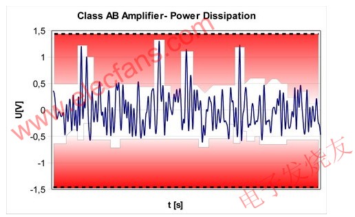 上述音频放大器的功率数值为峰值功率值。实际上,需要这个最大电源电压的时间极短;音频信号具有很宽的动态范围。大部分的时间,输出电压均低于0.5V,而放大器的电源电压却可达到1.5V。输出电压和电源电压之间的差异来自内部放大器晶体管所消耗的部分,这是电力损耗的主要原因。
