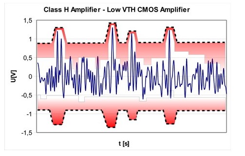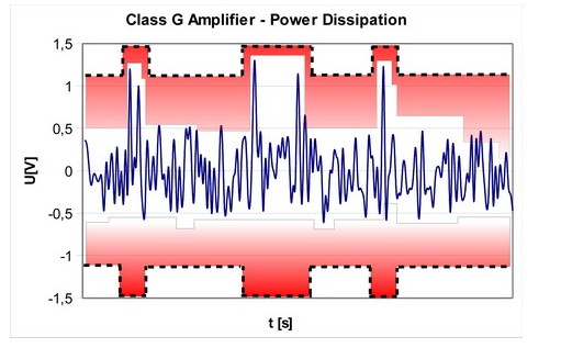 为解决这个问题,G类和H类放大器采用的放大器电源电压要在一定程度上满足所需的输出功率。G类放大器一般有两种电源电压水平。较高的电源电压水平由所需的最大输出功率决定。较低的电源电压水平则由最小电源电压决定,放大器能够在这个电压下工作,且这个电压高于总谐波失真(THD)的阈值。