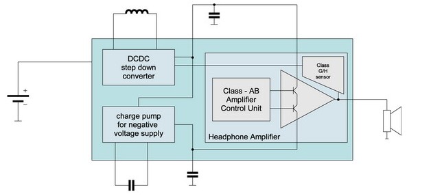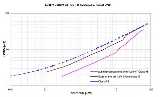 如同我们看到的,影响传统音频放大器效率最重要的参数是峰值输出功率。这主要由设备使用的耳机类型决定:相对于头戴式耳机,耳塞式的峰值功率要求较低,不过两个声道的典型输出功率值范围为各4mW,总功率可高达2×30mW。
