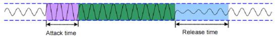 释放时间:释放时间的选择也取决于被处理声音信号的种类和希望得到的特点,短的释放时间可以很好地响应快速变化的声音信号,比如急促的枪炮声和尖锐短暂的报警声,长的释放时间会使声音平滑,柔和。典型的释放时间为20ms-5s
