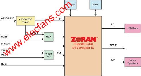 SupraHD 760系列处理器在单芯片解决方案中整合了领先的HDTV处理器和8VSB解调器,使数字电视制造商能够生产高性价比的数字电视机产品。