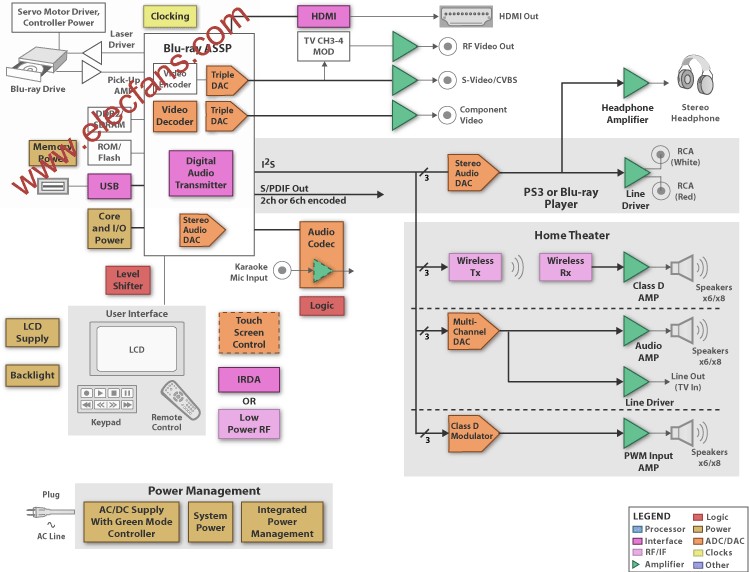 DSP/ASSP – 执行MPEG解码、音频处理,控制系统电子、光盘驱动和用户界面。由于能够集成多种功能,可能需要在音频和视频面上分立的解决方案。