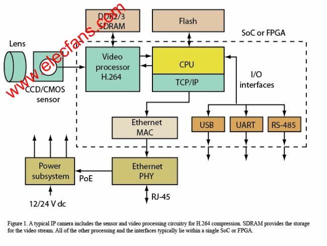 图1:典型的IP摄像机包含面向H.264压缩的传感器和视频处理电路。SDRAM提供视频流的存储。所有其它处理和接口通常都位于单片SoC或FPGA上。