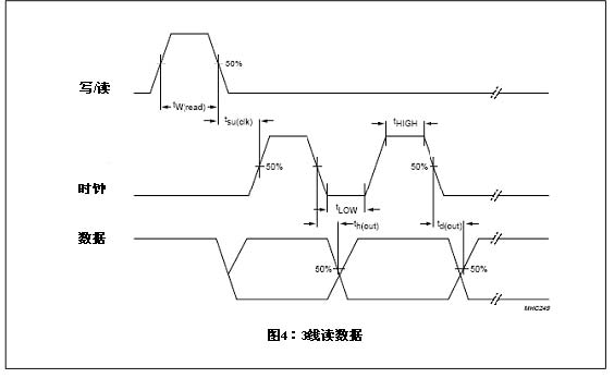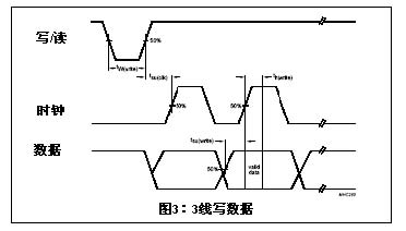 (5): 3-线说明3-线控制:写/读,时钟和数据线;工作在最大时钟频率为1MHz。提示:通过standby位设置,芯片可以工作在省电的待机模式。在待机模式下芯片必须设置在写模式。在待机期间,当芯片设置为读模式时,芯片会保持数据。屏蔽总线界面可以减小待机电流。如果总线界面被屏蔽则程序没有待机模式,芯片维持正常工作,但已经脱离时钟和数据线。