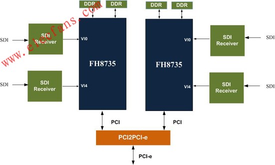 高清图像的图像质量至少3倍于D1的图像分辨率,此时富瀚FH8735优良的编码性能为HD-CCTV的原始图像压缩以及存储提供了强有力的保证。PCI/PCI-E的总线可以根据实际应用来选择,对于对预览要求较高的应用,PCI-E的带宽足以保证高清原始码流传输至HOST端进行后处理。同时也为智能分析提供了高质量原始图像的保障。