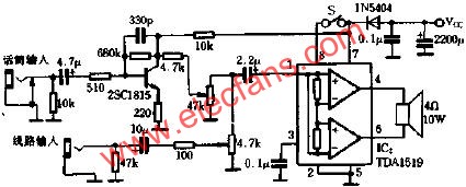 电路原理如图所示,它包括话筒输入和线路输入两个通道,苏州部分采用飞利浦公司推出的音频功率放大集成电路TDA1519,该电路具有工作电源电压范围宽、增益高、输出功率大、失真度小,外围元件少等特点,并具有负载短路、开路、过热等保护功能,TDA1519的优良性能决定了扩音的优越性,图中S为扩音机的静噪控制开关‘;整流管1N5404是为防止蓄电池反接烧毁集成电路而设置的。扩音机的扬声器要求不低于10W,以充分发挥其功率大的特点。集成电路的散热板要有足够的面积,以保证在任何条件下都能正常工作。