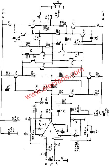 本电路如图所示,是用A1(CA3100)集成电路做输入级,而功放级则是用分离晶体管,实际上是具有公共反馈环的两个级联的放大模块。分列放大模块则由R17、R10和C8构成自身局部反馈。分列部分的输入级是一共基极VT12、VT13(Q12、Q13)电路,此级用做电压转换器并工作在A类,下一级VT1、VT2(Q1、Q2)也工作在A类,而其主要功能为电压放大。
