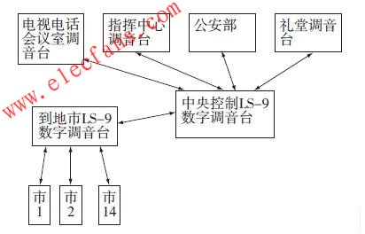 首先在信号汇集点图像控制中心放置两台LS-9,其中一台用来汇集各个会场以及公安部的音频信号,另一台用来接收和发送各市的音频信号;其他每个会场放置一台普通的调音台即可,用于与中心交换音频信号,如图1 所示。