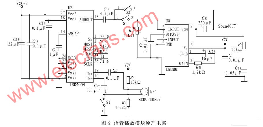模拟存储(Chip Corder)专利技术,声音无需经A/D转换和压缩,每个采样值直接存储在片内的闪烁存储器中,从而避免一般固体录音电路量化和压缩造成的量化噪声和金属声。图为语音播放原理电路。语音输人通过话筒(MIC)直接与ISD4004的引脚IN+、IN-连接差分驱动输入。语音输出端则是通过LM386放大后连接到电台的语音输出端。系统采用键控分段录放音模式。通过录音键可录制10段不同的语音,每段录音对应键盘上一个按键,根据所接收到的语音