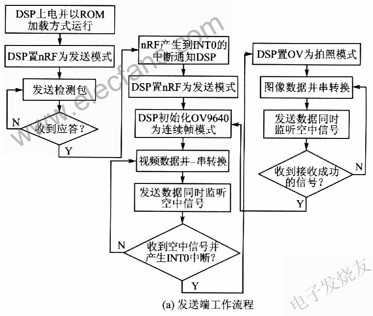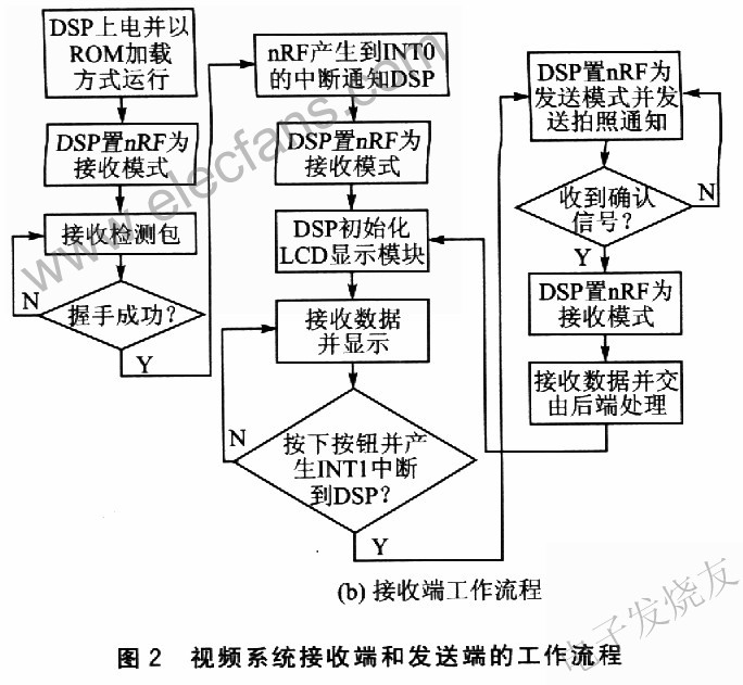在视频流传输过程中,nRF24LOl可以同时监听空中信号并自动应答。若收到来自接收端的拍照通知(按下按钮),则把OV9640设定为标准拍摄模式,分辨率为l280×960(@8bit)。然后,DSP将nRF24L01设定为发送模式,并将此时的帧数据发送出去。图像数据发送完成并等到接收确认信号后,系统将重新回到视频流模式。若接收不成功,则nRF24LOl的自动重发功能将确保数据传输的完整性。