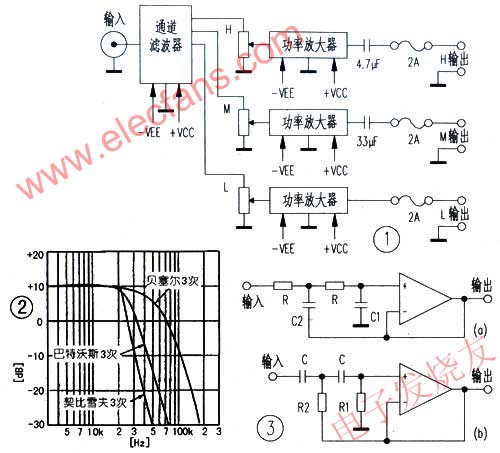 在前置放大器之后用有源滤波器分割频带,各频段有自己的功率放大器和扬声器,各频段的电平在各功率放大器之前用电位器调整。这种方式的优点是显而易见 的,它取消了前述 LC 网络,又能有效地利用各个扬声器的效率;同时,也降低了对功率放大器的频率要求,输出功率也可以小一些;这种结构示于图 1 ,其关键电路是有源滤波器。