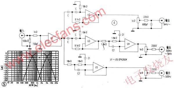 图 4 是一款音频用 12 分贝三通道电子分频器的原理图。选用多通道前级分频比在功率放大器后分频更能获得良好的音质。三通道分频的频率范围分别是低频~ 500Hz :