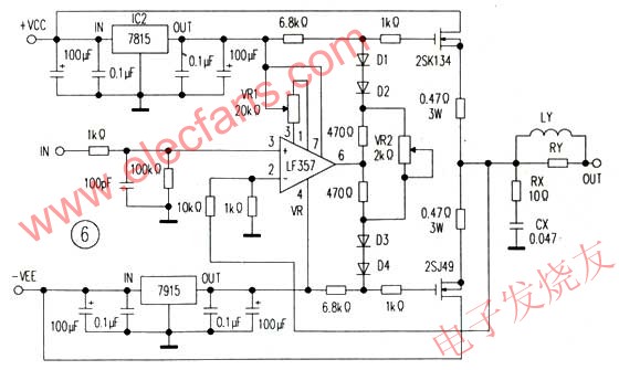 三路滤波器的输出信号分别接至相同的三个功率放大器,其电路示于图 6 。首先用输入级为 FET 的运放 LF357 作电流缓冲,末级功放管采用高频特性好的 MOSFET ,偏置电路用二极管和电阻构成.利用半可变电阻 VR2 设置静态电流,静态电流的测定可在无信号时测量源级电阻 (0.47 Ω ) 两端电压。然后利用公式 I="U" / R 算出。末级负反馈从 MOSFET 的源极加到运放的反相端。由于用作驱动的运算放大器的电源电压不能过高,限制了功放的最大输出。如运放电源电压为± 15V ,驱动级最大输出电压为土 12V=24V ,扬声器阻抗 RL="8" Ω,则末级最大输出功率 P="Vcc" × (VCC / 8RL)=24 × 24 / 64=9W 。这个功率似乎偏小,但实际上这只是一个频段的输出功率,加上另外两个频段的输出功率,已完全适用。
