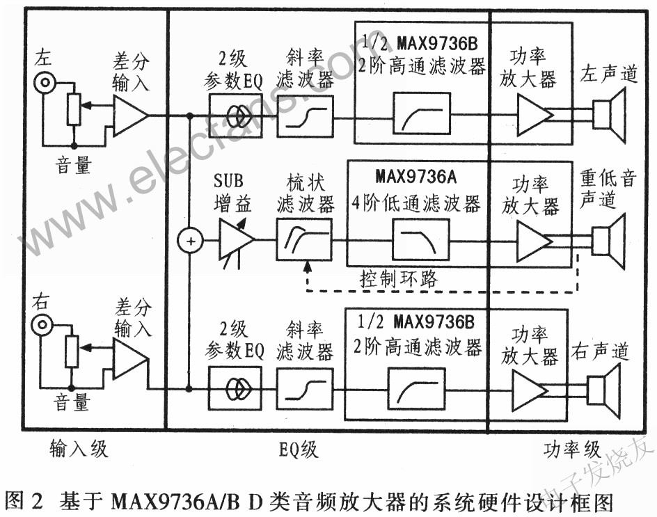 该系统硬件电路设计有左,右声道和重低音声道两部分。每部分包括输入级、EQ级和功率级,如图2所示。