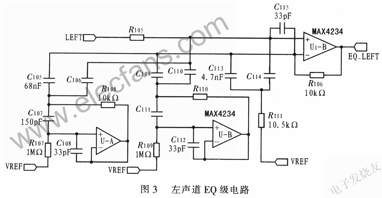 输入级之后,左/右声道信号进入两级参量EQ电路,电路分别位于左/右声道附近。每路参量EQ使用一个运放回转器模拟LC串联谐振电路中的电感。串联电路两接入点实现衰减或放大,这些接入点通过两只电容实现。图3为左声道EQ级电路。图中,电容C105和C106是左声道的第一级参量EQ,是左声道的提升和衰减节点。如果只使用C106(没有连接C105),谐振电路与串联电阻R105(10kΩ)组成一个分压器,对谐振频率信号进行衰减。相反,如果只使用C105则降低反馈,使谐振频率信号提升。如果两只电容都不使用,则该部分电路禁用。