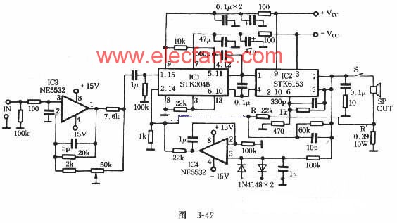 STK3048和STK6153内部电路较为简单,其音质甚佳。但外围线路的设计和外围元件的选用对IC音质影响较大,故本功放采用如图3-42所示的电路。