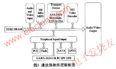 硬件平台以SMP86 54芯片为核心,通过总线与RAM、SATA硬盘、Flash闪存、输入输出设备等外设相连。SMP86 54是Sigma Design公司推出的多媒体播放SoC解决方案,集成了一个强大的多媒体处理器、强健的内容保障系统、新的DDR2内存控制器、多个片上CPU以及完备的系统外围设备接口。从媒体播放角度看,SMP86 54提供了一个完整支持高清晰度视频解码的先进解码引擎,能够支持对MPEGl、MPEG-2、MPEG-4、H.264、WMV9、VCl以及AVS等格式的硬件解码,支持高效能的图形加速,支持多标准音频解码和先进的显示处理能力。Siena Design公司为方便第三方厂商开发应用,提供了与芯片相关的开发工具包和开发框架。本文的工作也基于这个框架进行二次开发。软件平台方面,由于一个完善的播放系统已经相当复杂,不适合直接操纵底层硬件来完成功能,需要操作系统的支持。本项目中操作系统采用uclinux,文件系统采用Romfs。uclinux是专为嵌入式系统定制的一款Linux,它具有标准Linux操作系统的稳定性、强大网络功能等主要优点,但是却不像标准Li-nux那样复杂,主要针对没有MMU(内存管理单元)的微控制器。Romfs是一款专门为嵌入式系统设计的文件系统,体积小、可靠性好、读取速度快,是嵌入式系统常用的文件系统。