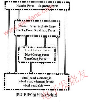 MKV文件格式的显著特点是模块化、结构化存储。每一个高一级的元素由若干次一级的元素组成,直至最基本的组成元素,每个元素都是一个TLV结构。一个标准的MKV文件有两部分组成:EBML Header和Segment。EBML Header由EBMLVersion、DocType等子元素组成,包含了文件的版本、文档类型等相关信息。Segment部分保存了媒体文件的视频和音频的实际数据,其data部分又可以分为SeekHead、Tracks、Cluster等若干子元素(表1)。所有元素的处理都可以按照一个统一的流程来进行。我们可以仿照TCP/IP协议分层的思想,对每一层的每个功能都用一个函数来完成,使用更底层的函数完成此项功能,并可被更高层的函数调用。文件解析时,从文件顶层开始,每当上一级的元素解析到有某个子元素时,调用此函数进行次一级的解析,依次直至文件结束,即可完成对文件的解析处理。整个MKV的解析调用过程如图3所示。Hea-der Parse和Segment Parse为文件最上层的元素解析函数,Cluster Parse、Tracks_Parse等为次一级组成元素的解析函数。ebml_read_ele-ment_idebml read element length为最底层基本组成元素的解析函数。