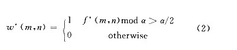 式中rood为模运算,[α/4,3α/4]是一对最好的参数选择,他保证了0和1都 在具有相等的最大判决范围,使得嵌人水印之后f′与/的差值在[一0.5α,0.5α]之间。当w(m,n)=1时,f(m,n)mod α=3α/4;当ω(m,n)=0时,f(m/n)modα=α/4。因此当提取水印时f*满足f*(m,n)mod α>α/2,那么提取的水印值为ω*(m,n)=l,否则为0。