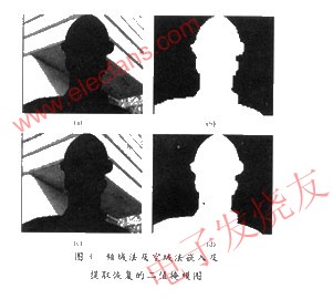 在第二部分已经阐述了,现有的方法很可能对这种情况不能得到很好的解决。若发生很严重的传输错误或很高的丢包率则形状信息会受到严重的破坏,影响视频对象的正确解码。利用本文提出的两个算法,从接收到的背景绿色分量中提取作为水印的形状信息,本方法的前提是背景的正确传输。图3(a)和图3(b)分别是用频域法嵌入后在解码端正确解码的视频背景对象的效果,以及正确提取恢复的二值掩模图,图3(c)和图3(d)是用空域法嵌入的效果图和提取恢复的二值掩模图。