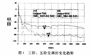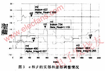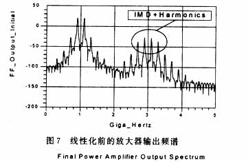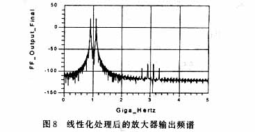 ADS2003进行系统级的仿真,在功率回退5 dB的情况下其仿真结果如图3~图8所示。图3表示自适应调整过程中α、β实部和虚部的变化情况,由图可以看出α的调整过程要先于β的调整。三阶、五阶交调总的变化趋势可以从图4看出,由图可知当调整继续进行下去三阶交调改善40 dBc,而五阶交调稳定后改善65 dBc。图5表示初始的误差频谱,图6表示调整后的误差频谱。图7表明功率回退5 dB的情况下产生较大的交调功率和谐波。图8表示经过自适应处理后前馈线性化器的输出。仿真结果表明经过自适应前馈处理,三阶交调和五阶交调均得到明显改善,功放的线性度明显提高。
