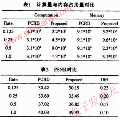 这里,我们用512x512的lena图像进行测试,表1记录了PCRD与新方法在计算量和内存使用量上的对比。表2所列是两种方法在PSNR上的对比。两种方法的解压图像效果如图2所示。