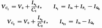 C1,C2分别经Q5,Q4充电使Vc1=Vc2=Vb=4 V,当Iin>O时,两路分别和由Q8,Q7构成的电流镜形成放电回路,分流控制电容电压值。电容电压为:
