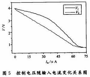 使用HSpice电路仿真软件在UMC 0.5μmBiCMOS工艺库下仿真。在Vb=4 V下对控制电路进行直流分析,图5为控制电压随输入电流大小变化关系图。从图中可看出,无放电回路时C1,C2充电在Vb=4 V,当0V2;当30μA