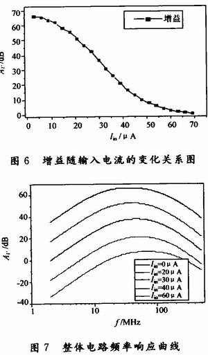 图7为电路在5种不同输入电流时的频率响应。当输入电流为0时,放大器处在最大增益处66 dB;输入电流增加,控制电压减小,增益减小;当输入电流超过60μA时,Av下降到0 dB左右。总增益变化和输入电流成反比。噪声系数仿真不超过28 dB。