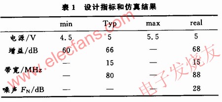 增益分配对接收机来说很关键,设计要求最大增益为60 dB。本文采用三级差分放大器串联组成,每级控制范围20 dB左右,最高66 dB,最小带宽为15~88 MHz,满足设计指标,见表1。