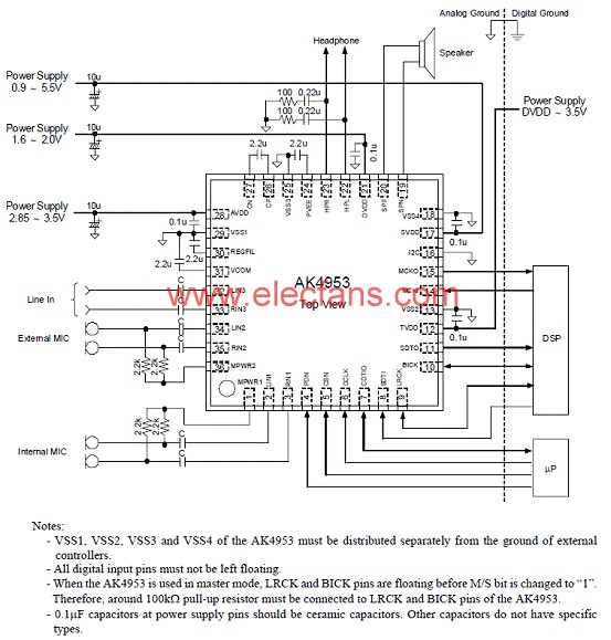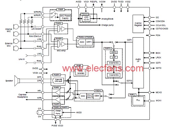 AK4953A是AKM 公司的集成了MIC/HP/SPK-AMP的24位立体声CODEC,输入电路包括麦克风放大器和自动音量控制(ALC)电路,输出电路包括无电容的耳机放大器和扬声器放大器,集成的电荷泵电路产生负电压,因此输出不需要AC耦合电容,工作电压0.9V-5.5V,主要用在具有录音和播放功能的手提设备.