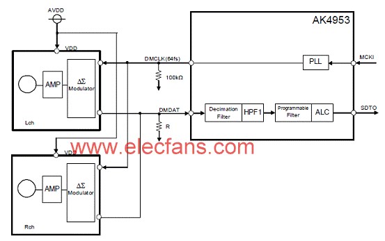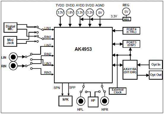 本文介绍了AK4953A主要特性,方框图, 立体声和单声道的数字MIC连接案例, 3线串接模式的系统连接框图以及AKD4953-A评估板主要特性,方框图和电路图.