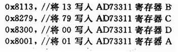 (4)上电复位后,AMBE-2000的CODEC_TX_DATA信号应与AD73311的串行输入隔离开,并保持365 ms左右,这时,利用FPGA配置AD73311,配置字如下: