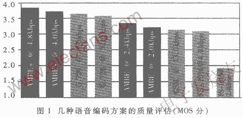 (1)具有高语音质量、低速率的全双工编码器。编码速率从2.4kb/s至9.6kb/s可变,语音质量和其它声码器的比较如图1所示。欢迎转载,本文来自电子发烧友网(http://www.elecfans.com )