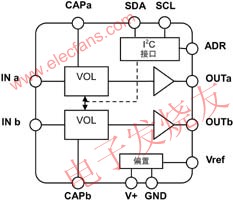 ---日本JRC公司推出的NJW1109是一种有电子音量控制的耳机放大器,图5是该器件的内部结构框图,由微处理器经SDA、SCL来控制音量。该器件内置1/2V+偏置电路(Bias)在Vref端外接10μF旁路电容。INa、INb为音频信号输入,OUTa、OUTb为两路输出(接立体声耳机)。SDA为I2C总线数据输入,SCL为I2C总线时钟输入,ADR为I2C总线从地址选择端。该器件有14管脚DIP封装、DMP封装及SSOP封装。