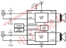 ---该器件特点包括:无须输出滤波器;可选择6dB或12dB的增益;外围元件少;有“咔啦”、“爆裂声”抑制电路;有微功耗关闭控制;有短路保护;小尺寸14脚SDA封装。增益选择(GAIN SELECT)端接高电平时增益为6dB,接低电平时为12dB。SHUTDOWN端接低电平时为关闭。