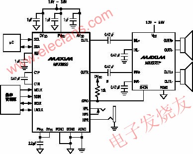 ---MAX9850的典型应用电路如图4所示。图4中,立体声耳机可插入HPL、HPS、HPR耳机插座中。另外,由OUTL、OUTR线输出经0.47μF输入电容器,输入到MAX9701功率放大器,驱动左右两扬声器。