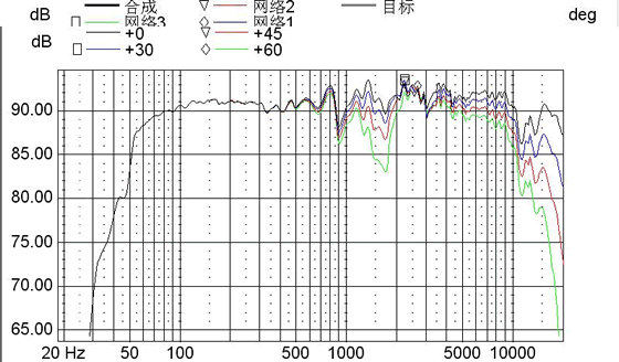 在障板上设计各单元的位置特别是中高单元的位置。因为两者都是球顶型的单元,扩展性都较好,这样一来面板的位置也得注重,尽量的控制单元受障板衍射响而出现频响上太大的峰谷。在此箱中使中高音都偏中间的方法来缓解障板衍射造成的影响。最初还想在中高音间的面板上粘上吸音棉。以缓解两个球顶型中高音间的干扰。但考虑到两者工作频率不一这个影响相对还不够大加之会影响扩散性所以放弃使用。偏中心安装单元同时也带来了声中让在垂线上不在一个中心上,这对近场听音多少有些影响。在远场后相对较小所以也没有关系。还是使用了。下面放一些指相性及模拟场面。