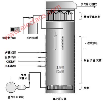 脉冲电源液中放电污水处理系统由等离子体发生与自由基注入系统、高效传质反应器、臭气净化等几部分组成,形成废水污染物降解、消毒灭菌和臭气净化的一体化。工艺流程如图2 所示。空压机将压缩空气通过微孔曝气供气系统对废水进行鼓泡,提供高强度气液传质,在放电等离子体自由基作用下快速完成有机物的降解、消毒灭菌,水面逸散的废气被集气系统收集,经放电等离子体氧化除臭后净化排放。实验测量特定废水处理前后水质指标,评价处理系统的处理能力、效果、能耗、影响因素以及经济性。