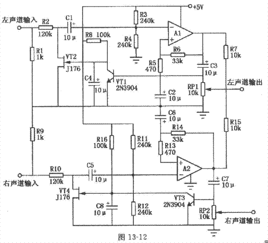 如图所示为音频AGC放大电路,这种放大器动态范围大于50dB,输出波形的失真非常小,并具有启动快、缓慢衰减等优点。电路输入40~20mV和输出0~1.2V可调电平,单电源供电,耗电电流小于1mA(5V电压)。VT2、VT4为P沟道JEFT,它与R2、R3、R4(R10、R11、R12)构成等效电阻分压器,接入输入回路。当输入电平低于40mV(峰一峰值)时,输入均等地在R2和R3、R4之间分配,A1的输出幅度不足以大到使正峰值检测器VT2导通。将结型场效应管的栅极拉到+5V,使其沟道夹断并从漏极到源极产生一个非常高的电阻。在输入电压峰一峰值高于40mV时,VTl在A1输出的正峰值导通,降低了结型场效应管栅极到源极的电压。沟道电阻用来减少并衰减输入信号,以保持Al输出电压峰一峰值在1.2V左右。