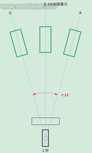 摄像头,即摆臂的原始状态在偏右的位置(在图2b中的A)。在摆臂驱动机构的带动下,摄像头顺序从右、中、左三个夹角互为150的位置,即A-B-C处分别采样。同时,图2a框图中的图像处理单元通过RS232接口,把摄像头在每个位置连续三次采样的数值结果,传输到可编程控制器PLC进行比较。如果上述连续三次的测得结果都相同,则这个数值被确认为可靠值,随后就存入PLC的堆栈,用于最终对三个方位检测结果比较,并找出其中的最大值。